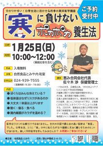 講師には恵み合同会社の佐々木先生をお招きして、冬の寒さを乗り切る方法やこの季節にぴったりの食養生のお話を楽しく講演していただきます(^^♪